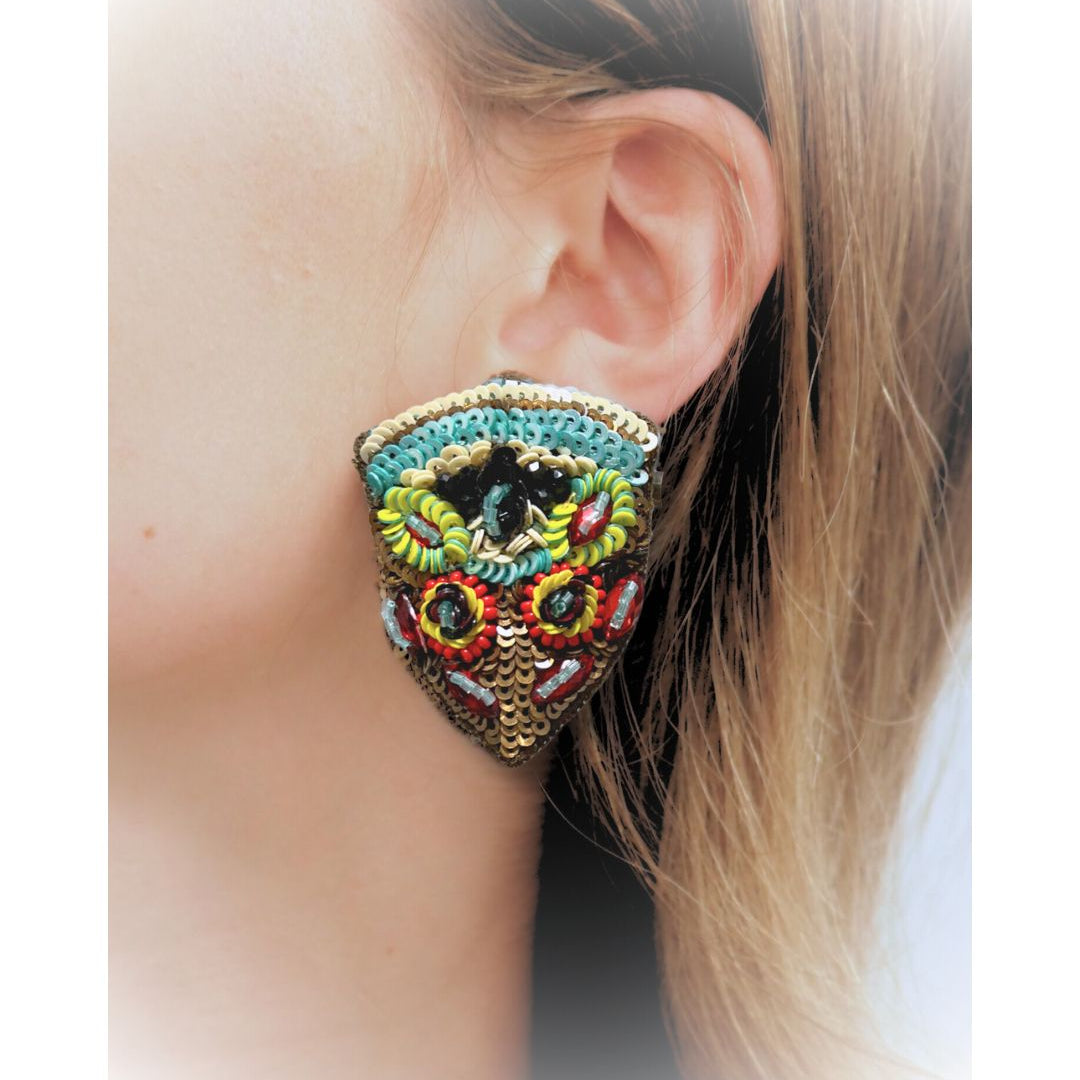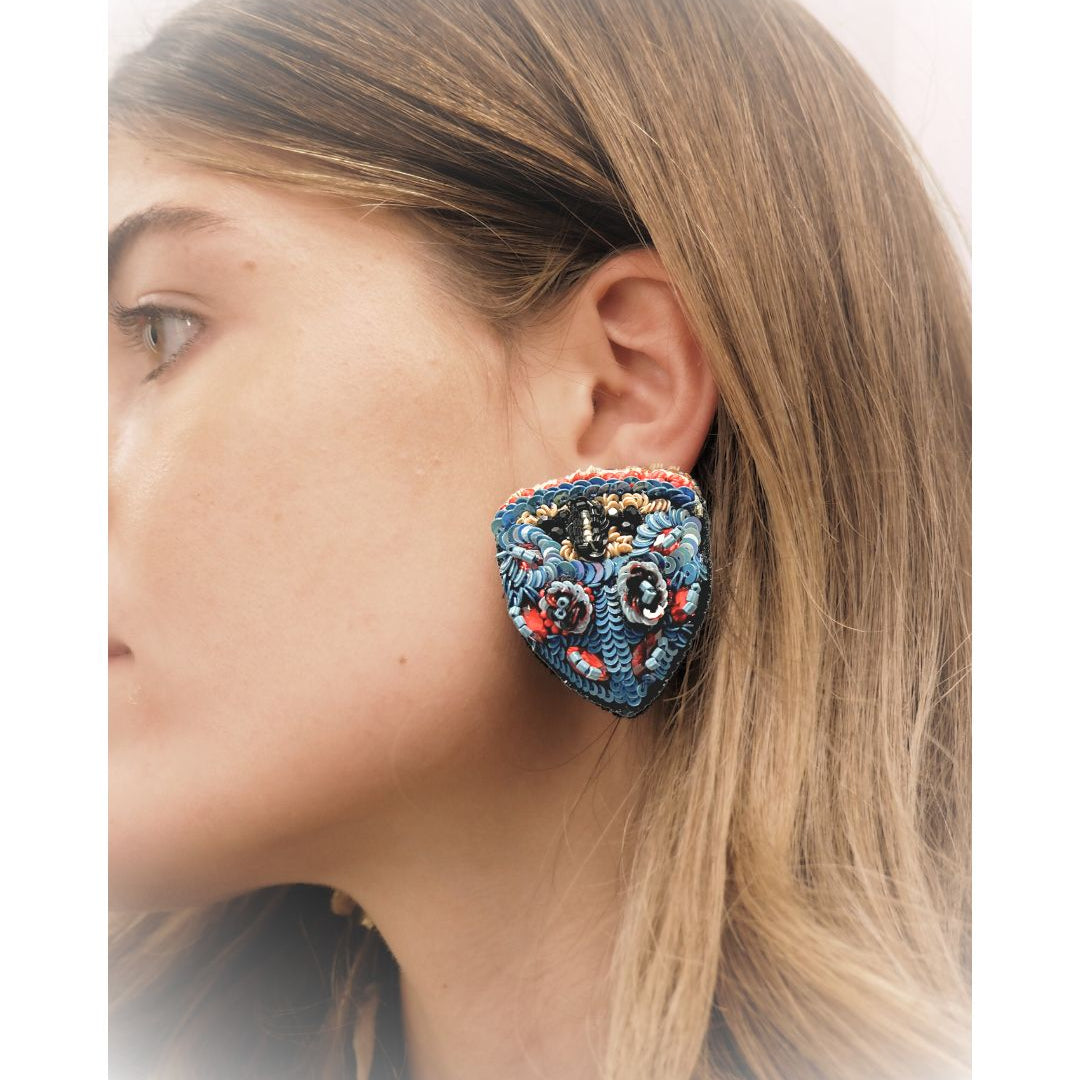 The earrings, inspired by the iridescent Picasso beetle, capture the brilliance of