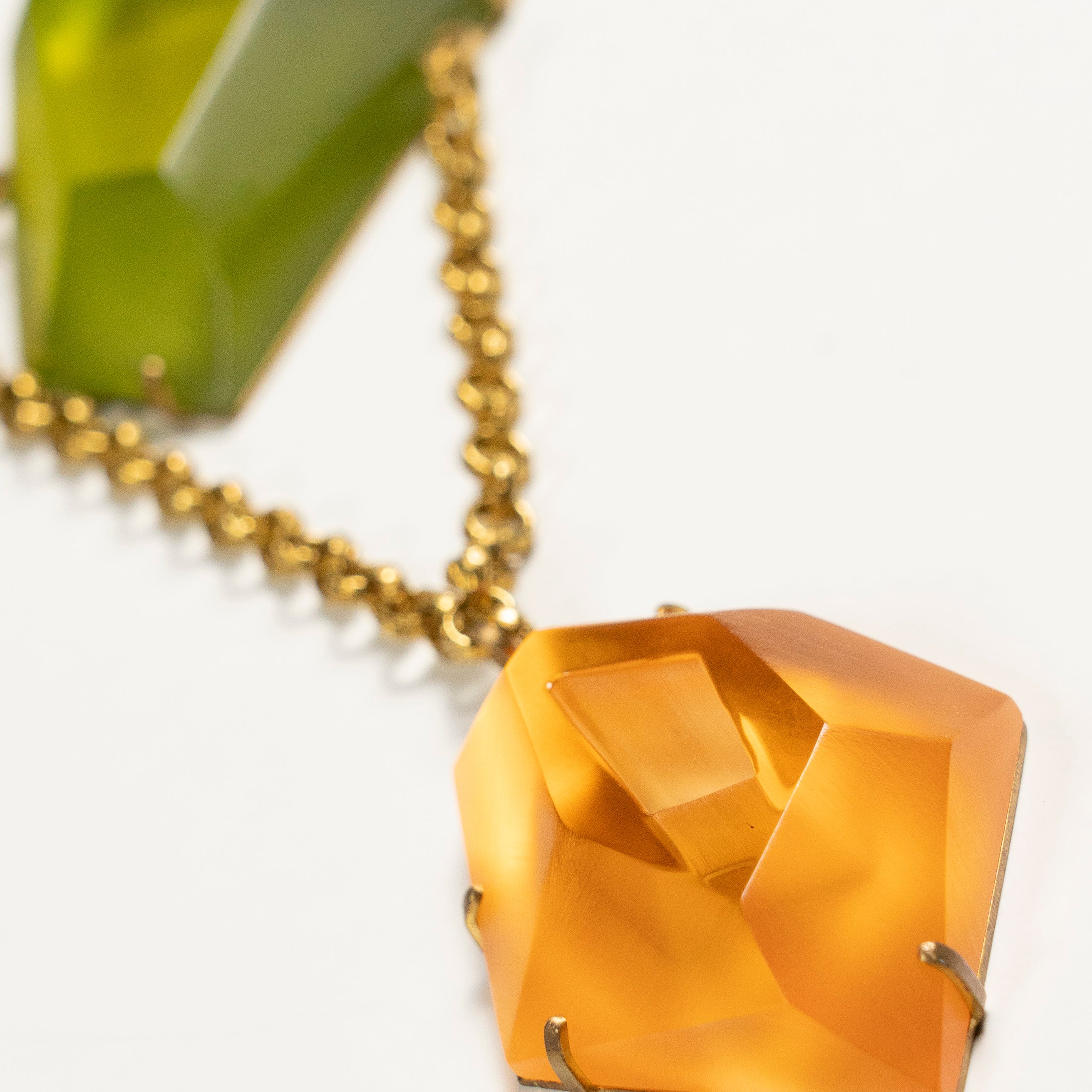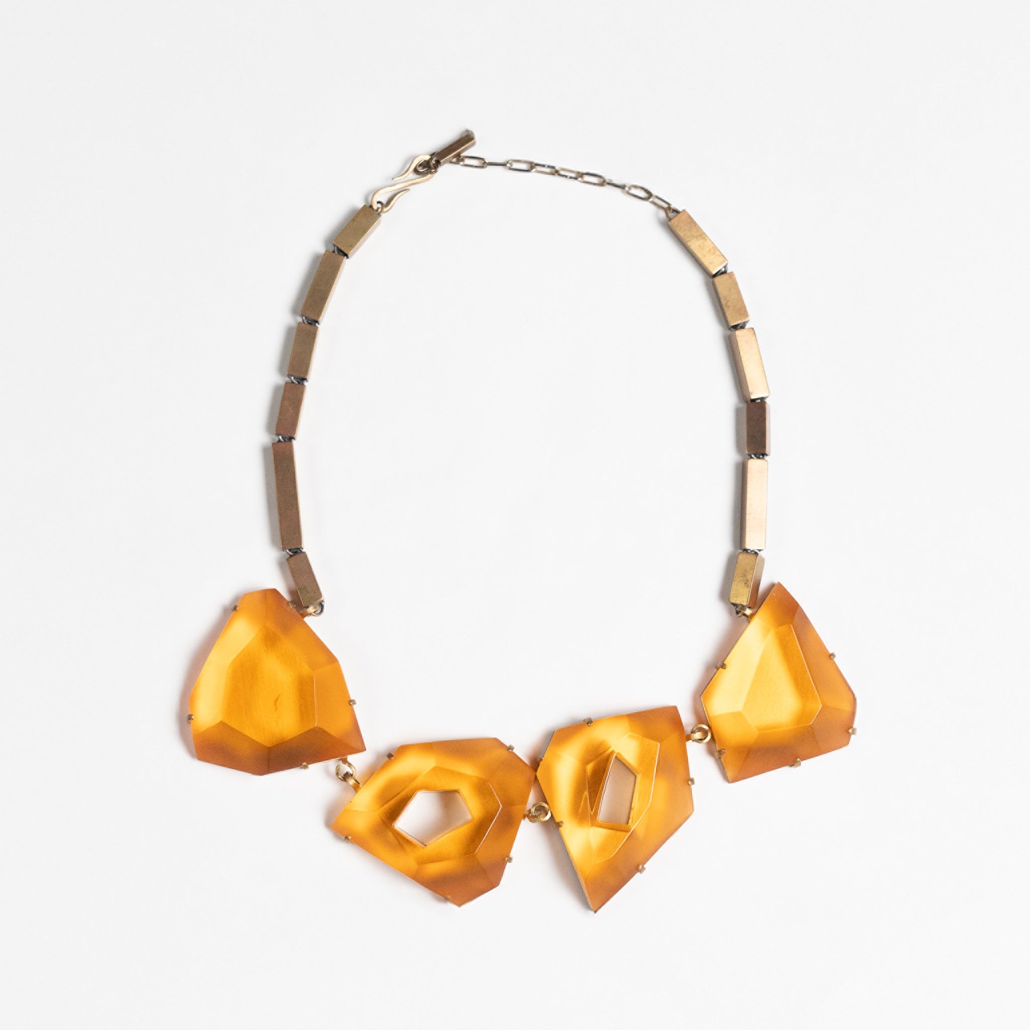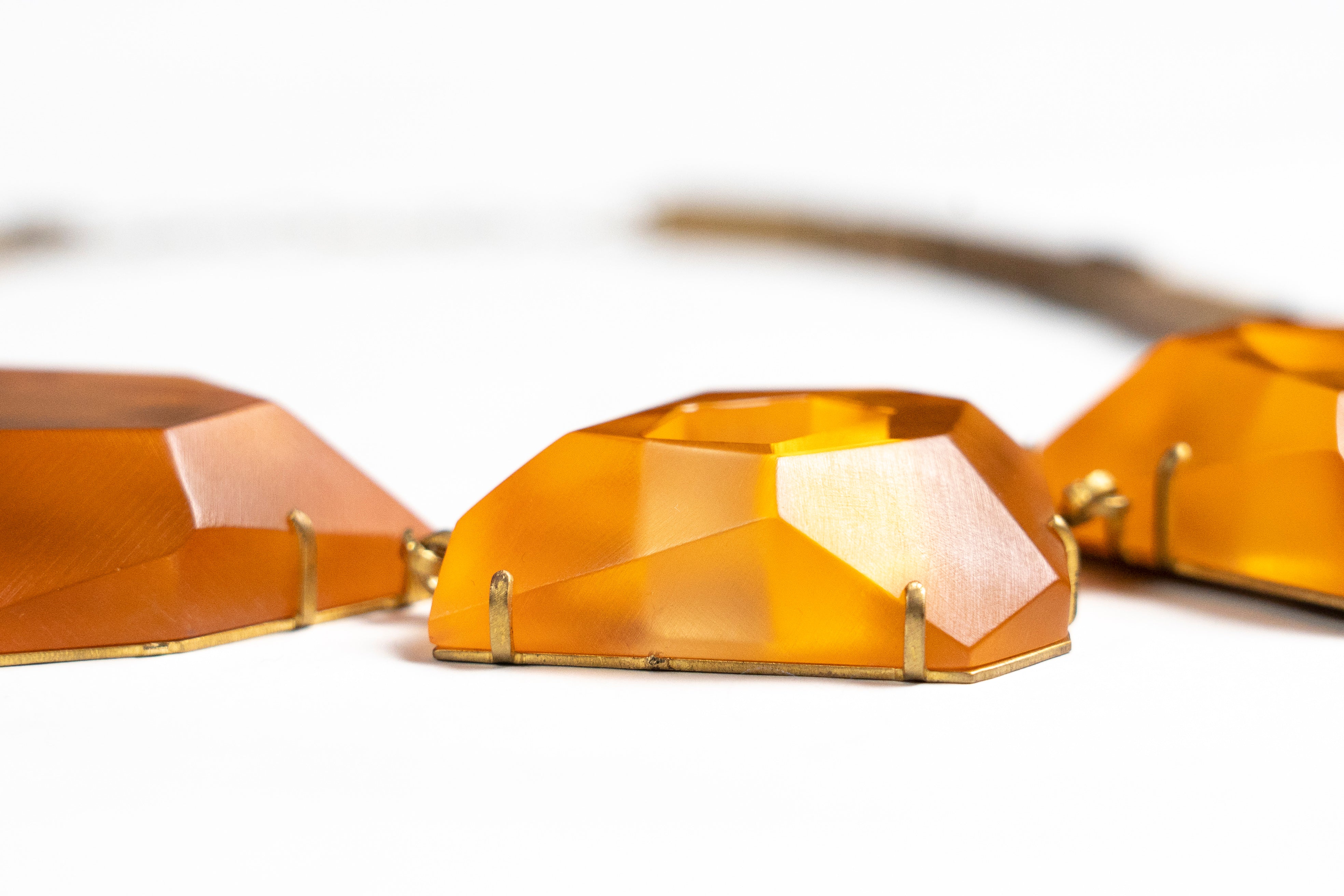Handcrafted in Holland, the jewels are made from brass and methacrylate, selected not only for their clarity and strength, but for how they evolve. Surfaces shift, patinas deepen, translucencies catch new light. Their transformation over time reveals a deeper beauty, one that unfolds slowly, gracefully, and with meaning.