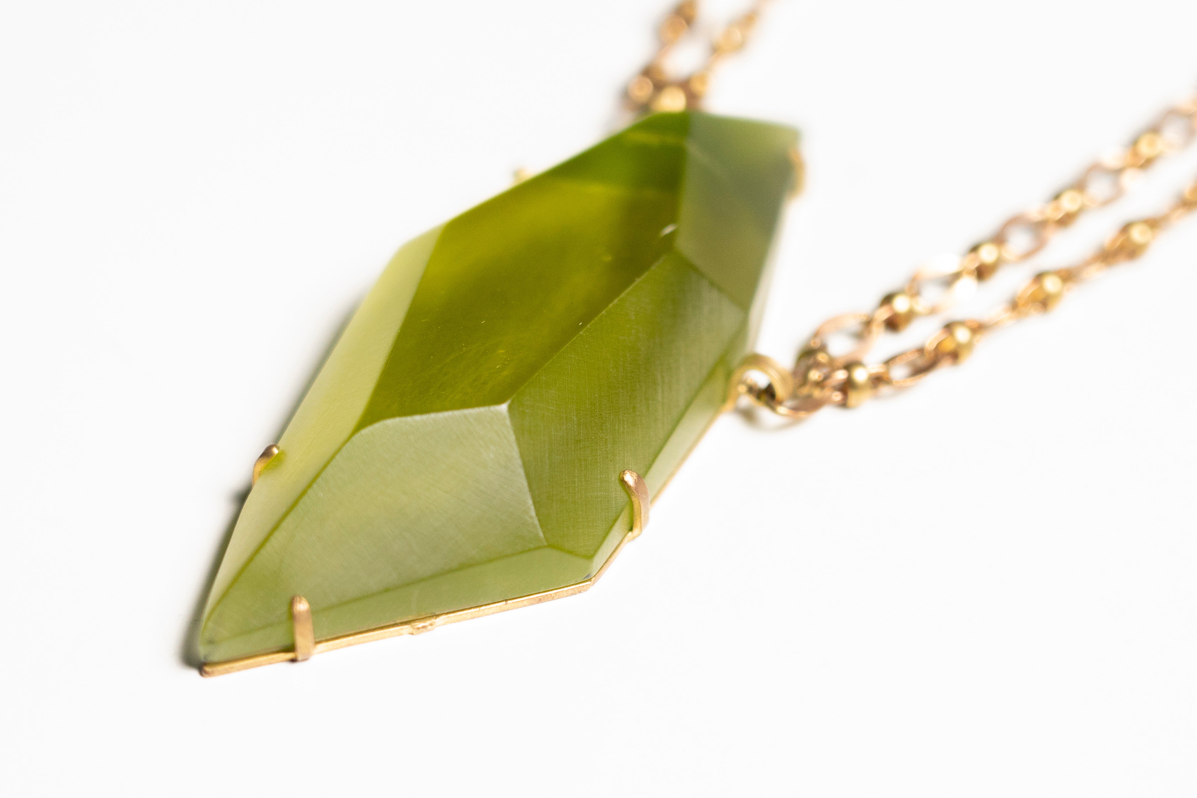 Handcrafted in Holland, the necklace features a luminous gradient green methacrylate stone, hand-polished to reveal its layered depth and light-catching surface. Resting on a hand-cut brass base, the pendant is suspended from a refined double metal chain, enhancing the contrast between strength and fluidity. The elongated silhouette makes it both commanding and graceful — a piece designed to be noticed and remembered.