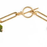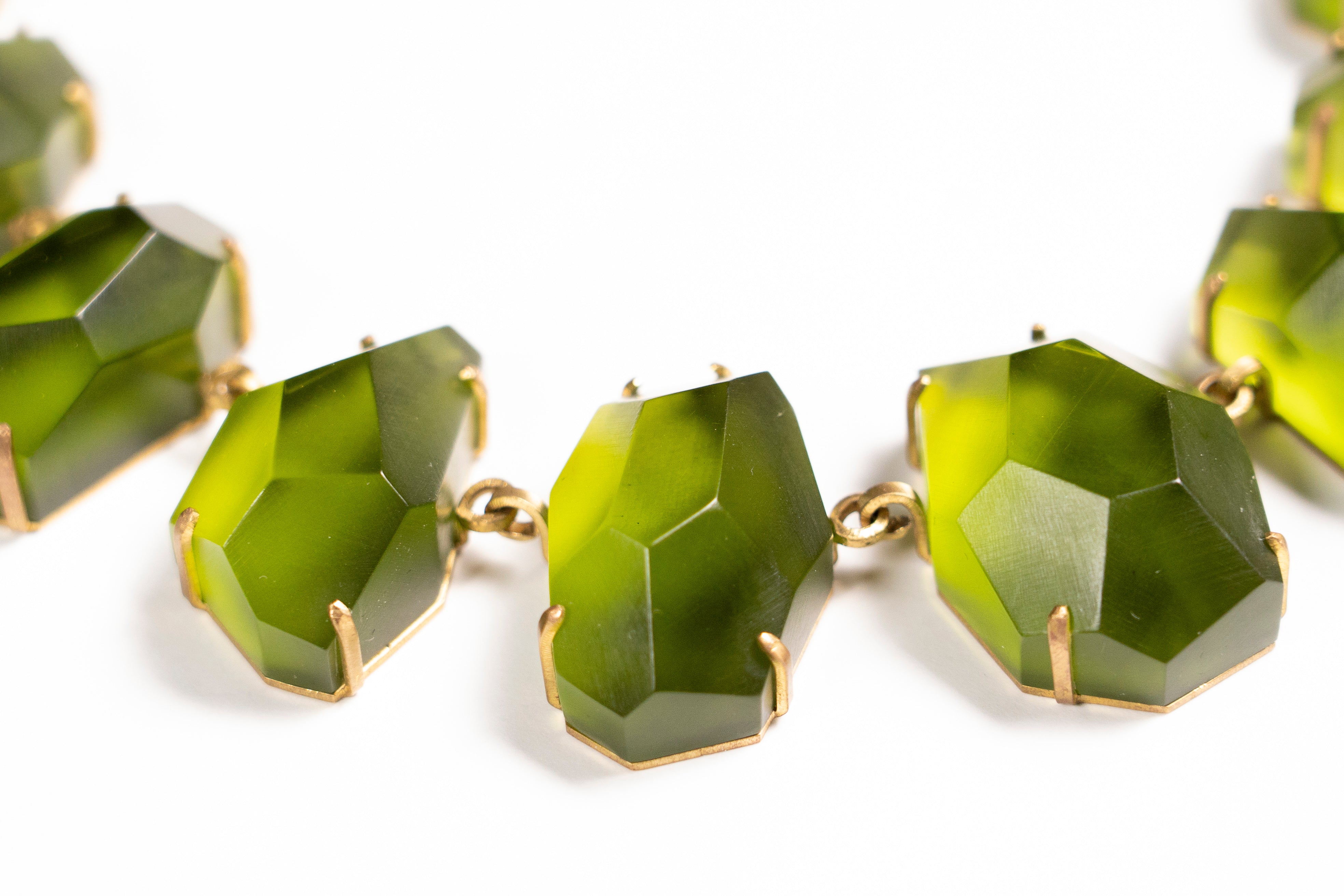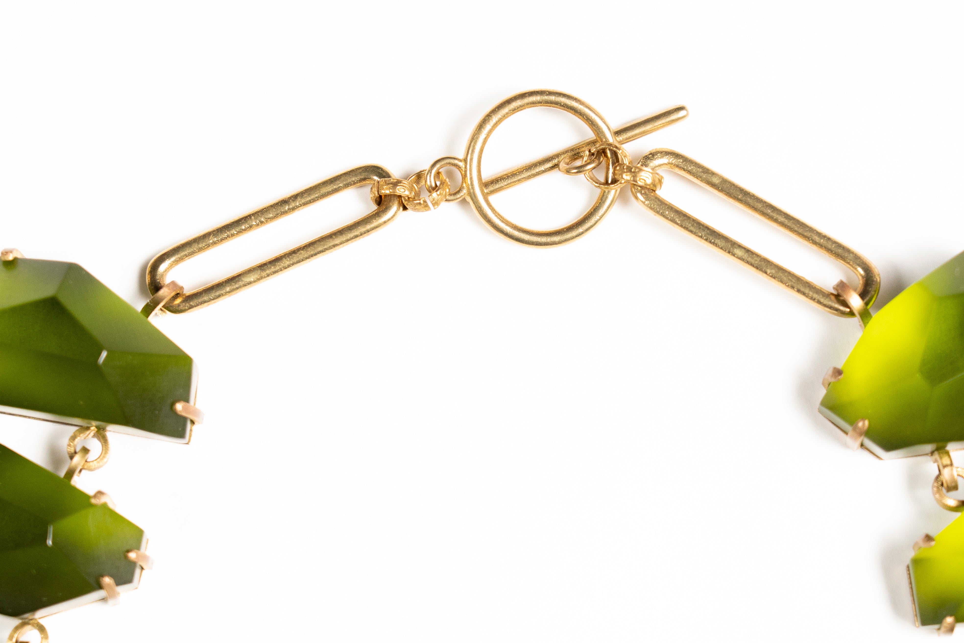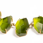 Handcrafted in Holland, the piece features irregular olive green methacrylate stones, each hand-polished to reveal layered depth and translucency. Set on a brass structure, the composition highlights the contrast between organic form and architectural line. The warm gold and rich green tones create a natural harmony, lending the piece a grounded elegance.