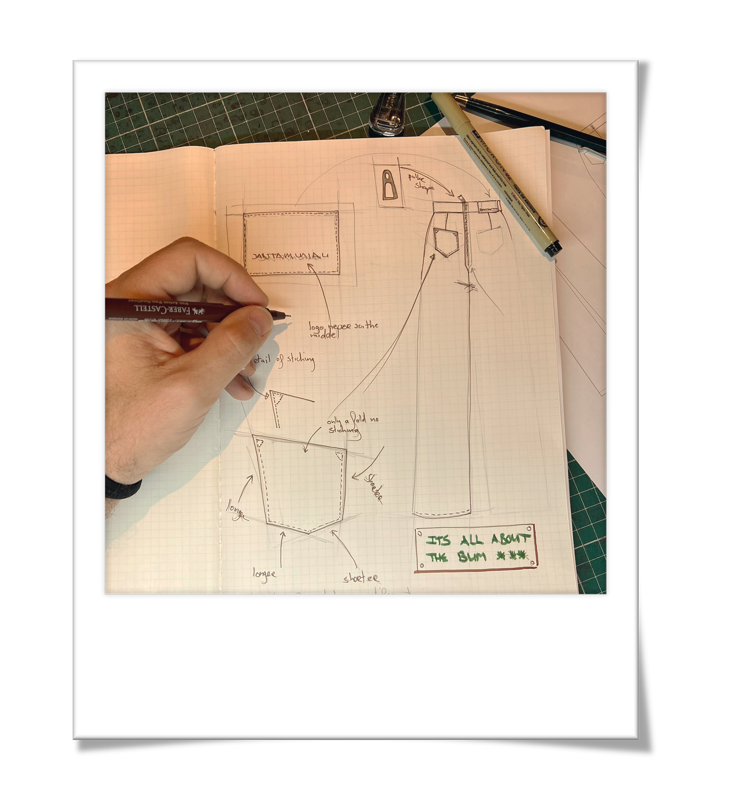 -The rotation of the pocket pattern enhances the curve of the bottom, rather than flattering it. The vertical lines drawn by the darts and the zipper seam provide verticality and elegance to the figure." - JANTAMINIAU