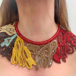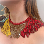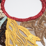 A wearable sculpture, this detachable neck piece transforms any silhouette into a statement. Hand-embroidered with a vibrant symphony of glass beads, it features intricate botanical motifs in amber, turquoise, saffron, and espresso, arranged like leaves caught mid-motion.